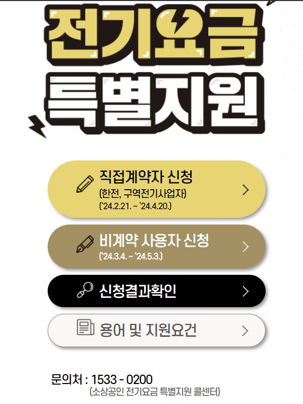 | 일반문의 | 소상공인 전기요금 특별지원 콜센터 | 1533-0200(평일 9시 ~ 18시) |